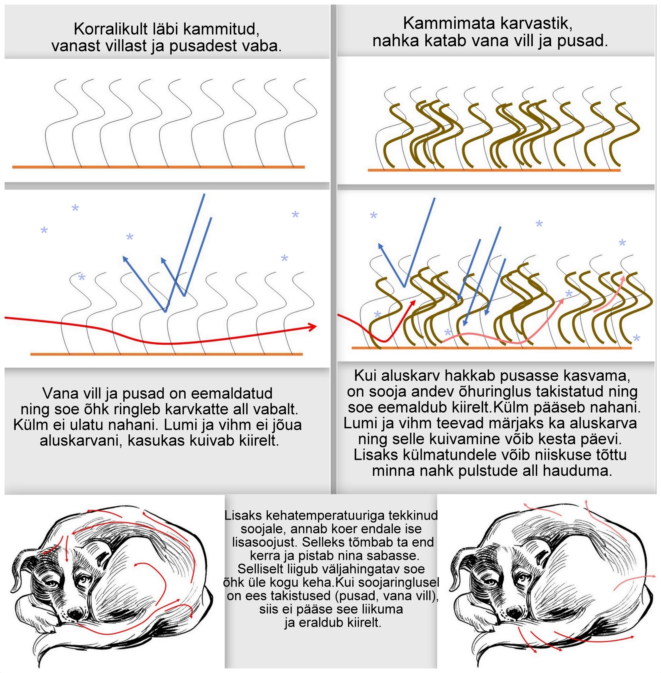 Sageli kardetakse, et lahtise villa välja kammimisel hakkab koeral külm, siis tegelikult nii see ei ole. Jah, koera vill on soe aga kui see on juba eemaldunud, siis takistab see nahal soojaringlust ehk vana villa soojaandvuse efekt on hoopis vastupidine. Ainult kammitud karvastik tagab talle maksimaalse sooja.
