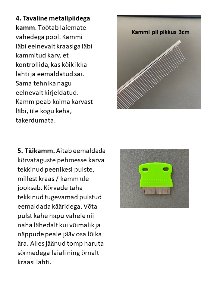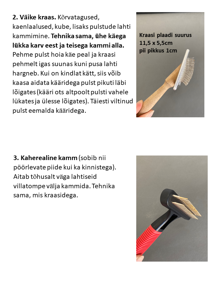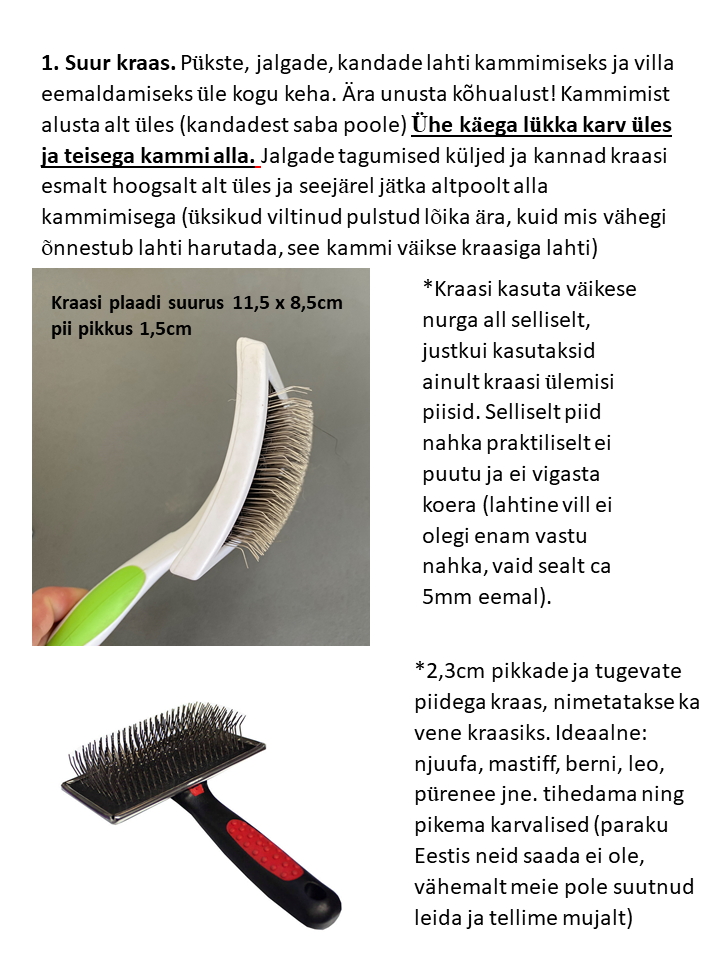 Piltidel tõin välja kammid koos kirjeldustega, mida ja kuidas meie neid oma igapäevatöös kasutame. Need kammid toimivad hästi topelt- ja pikemakarvaliste kammimiseks, kuid tegelikult töötavad praktiliselt kõikidel karvastikel…no aluskarvata lühikarvaliste koerte puhul tõesti ei ole neist tolku aga nende kammidest teine kord.